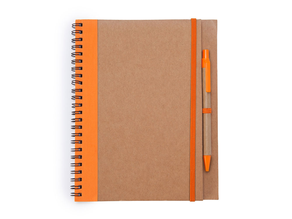 Блокнот на спирали с жесткой обложкой из переработанного картона. Включает шариковую ручку с синими чернилами. 60 простых листов.
