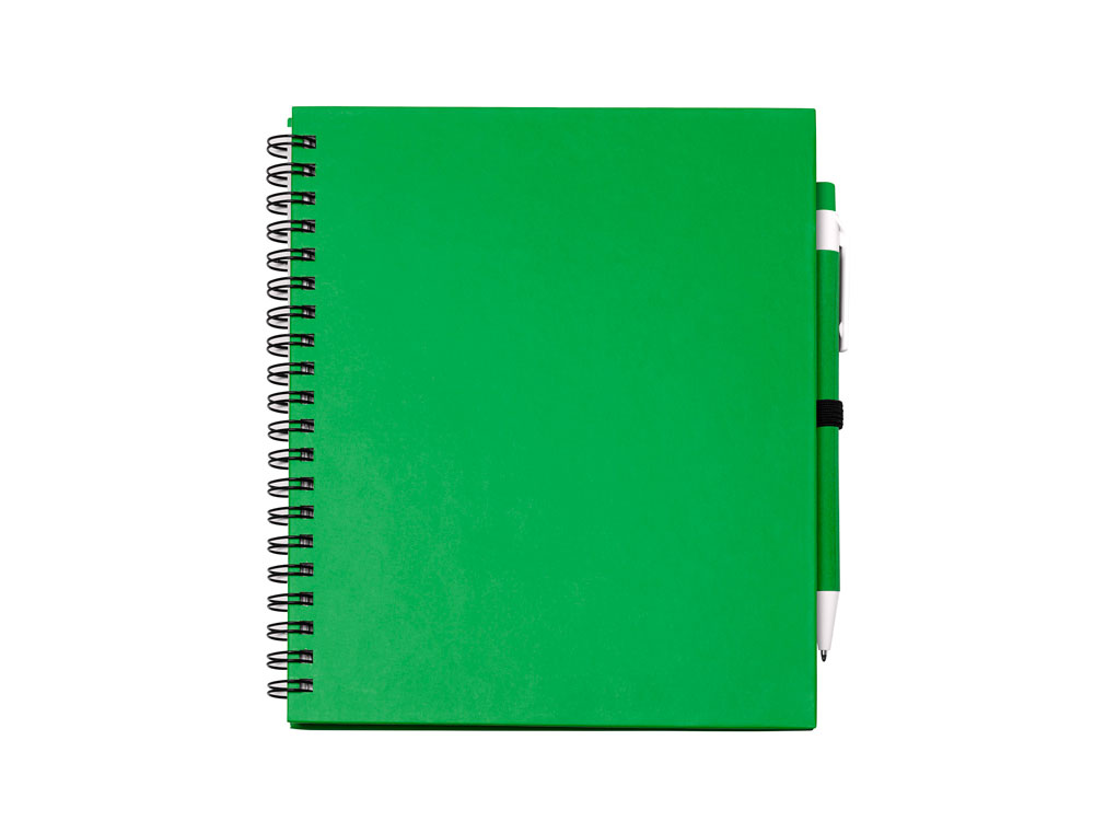 Блокнот на спирали с простыми листами и держателем для ручек. Твердая обложка и ручка из переработанного картона. 70 листов.