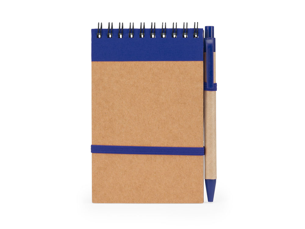 Блокнот на спирали с жесткой обложкой из переработанного картона. Включает шариковую ручку с синими чернилами. 70 листов.