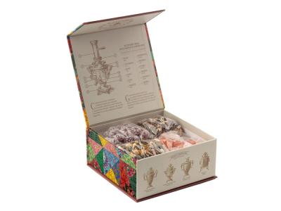 Купажи чая составлены так, чтобы сочетать вкус и аромат отборных сортов китайского и индийского чай с красотой разноцветных лепестков мальвы, лилии, жасмина и акации. В набор также входят монпансье со вкусом чёрной смородины и цукаты из кумквата. Внутри шкатулки находится мини-открытка, которую покупатель может подписать.