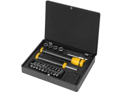 Набор инструментов от Stac включает 18 предметов. В набор входит 1 светодиодный фонарик, измерительная лента длиной 1 м, отвертка с магнитным удлинителем, 1 торцевой гаечный ключ и 4 головки гаечных торцевых ключей (7/8/9/10), набор из 9 бит для шуруповерта (PH, PZ, плоский и Torx). Коробка закрывается на магнитную крышку.