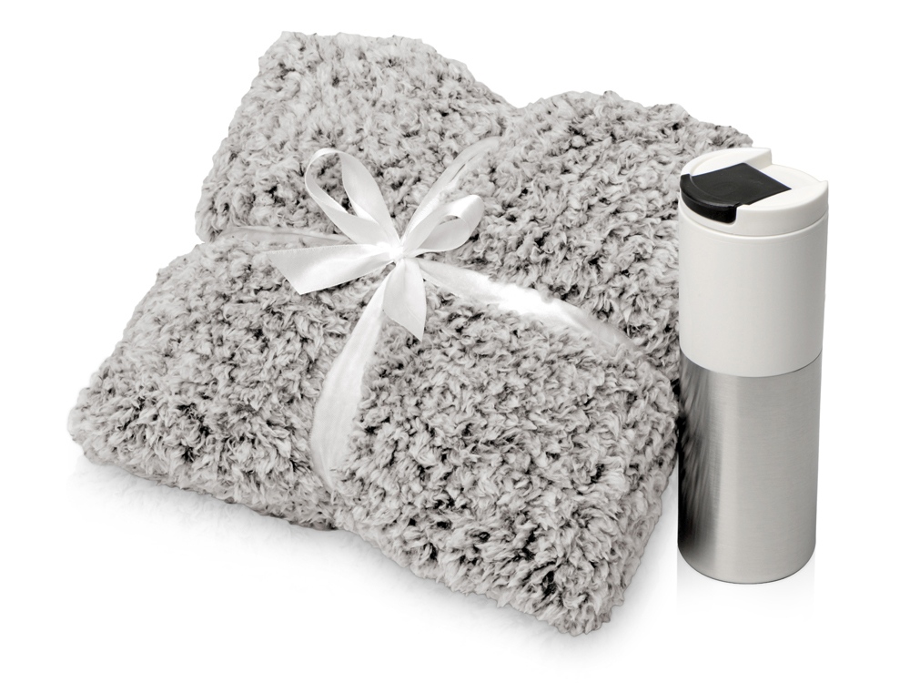плед- бело-черный, термокружка- белый/серебристый