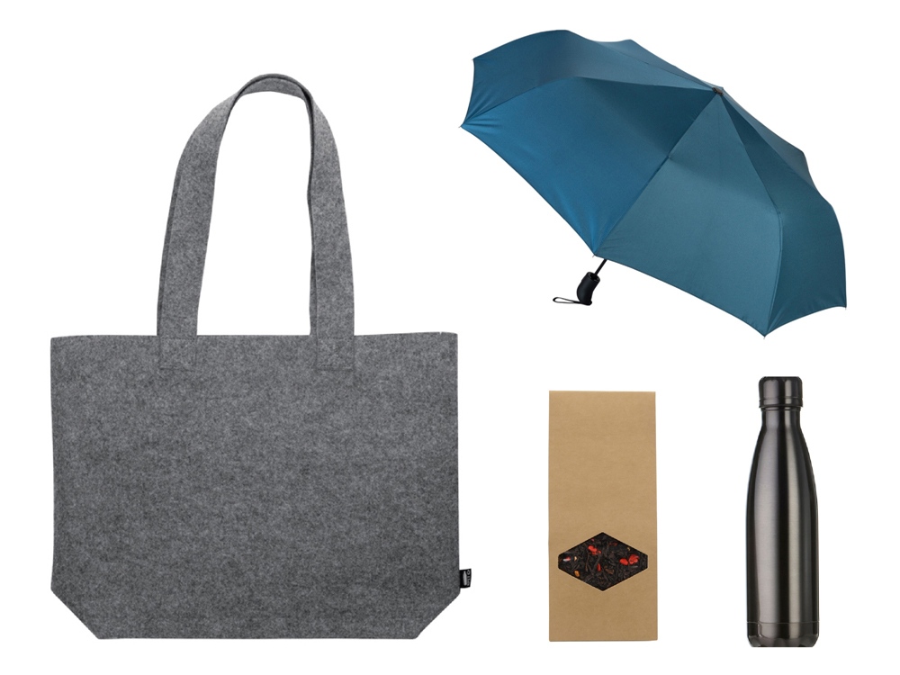 Набор подойдет как для городских прогулок, так и для выездов на природу. Термобутылка сохранит ваш напиток горячим, а зонт защитит от дождя.