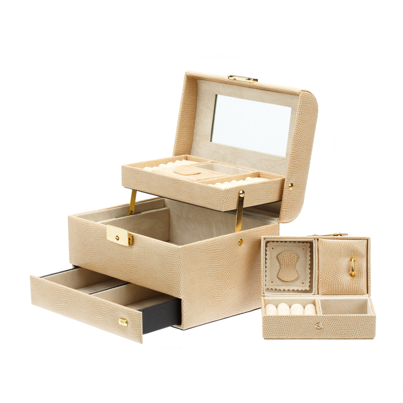 Такая шкатулка с удобной ручкой-переноской, выполненная в цвете бежевой рептилии, имеет 3 яруса и прекрасно подойдет для бережного и удобного хранения всех Ваших украшений.