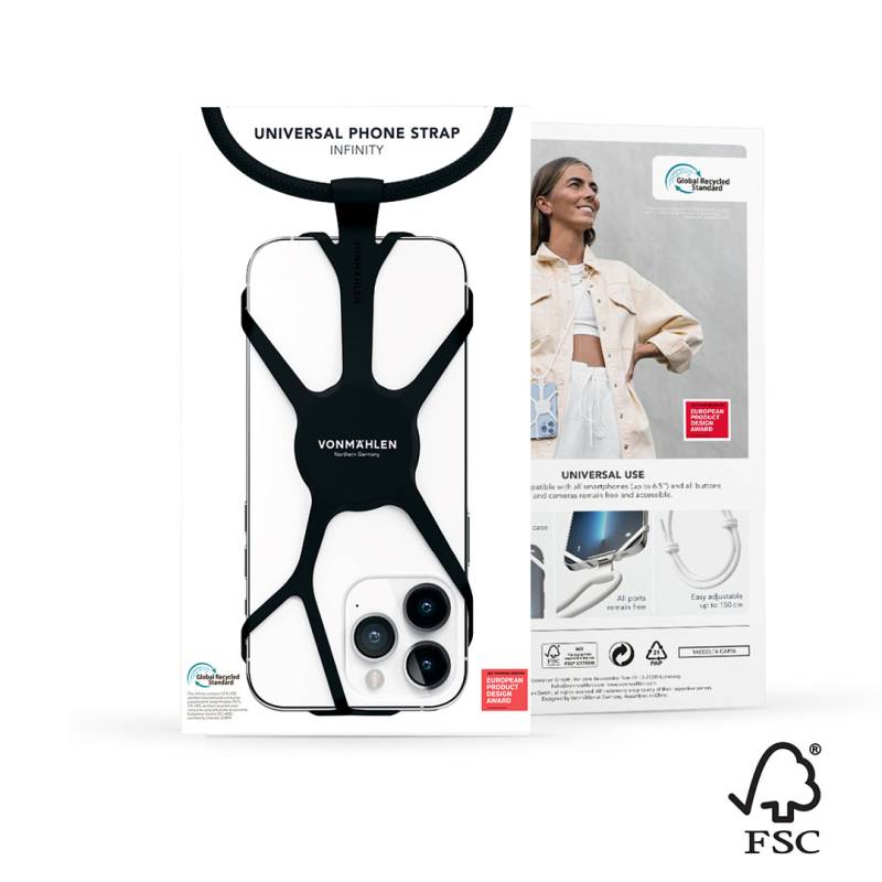 Универсальный ремешок-держатель VONMAHLEN Infinity совместим со всеми популярными моделями смартфонов. Его можно прикрепить всего за несколько секунд даже поверх чехла. Infinity сочетает элегантность и функциональность: интеллектуальный дизайн и полностью регулируемый нейлоновый шнур делают его по-настоящему идеальным аксессуаром. Гибкий силикон гарантирует, что ваш телефон всегда надежно закреплен. Ремешок-держатель не ограничивает использование кнопок или функций на телефоне. Примечание: • Индивидуальная поставка продукции из Китая со сроком производства от 4 недель. Цена по запросу. • Индивидуальная поставка продукции с перекраской в Пантон со сроком от 10 недель. Цена по запросу.