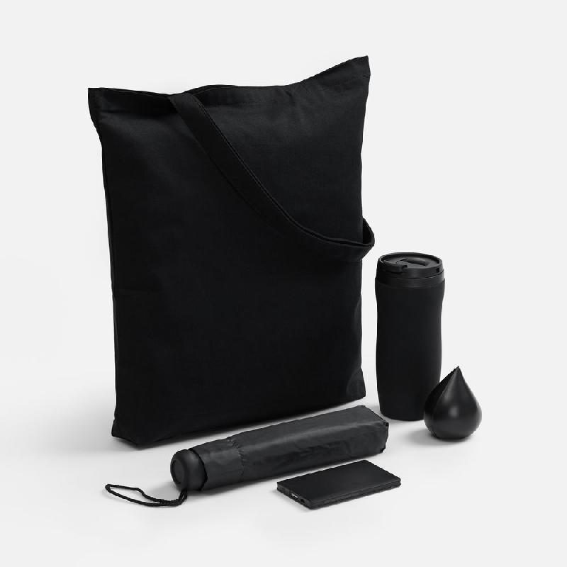 зонт - полиэстер 190T, ручка - пластик; покрытие софт-тач; каркас, спицы - металл; аккумулятор - пластик; внешняя стенка термостакана - нержавеющая сталь, 201, внутренняя стенка, крышка - полипропилен; сумка - хлопок 100%, плотность 210 г/м²; антистресс - вспененный полиуретан