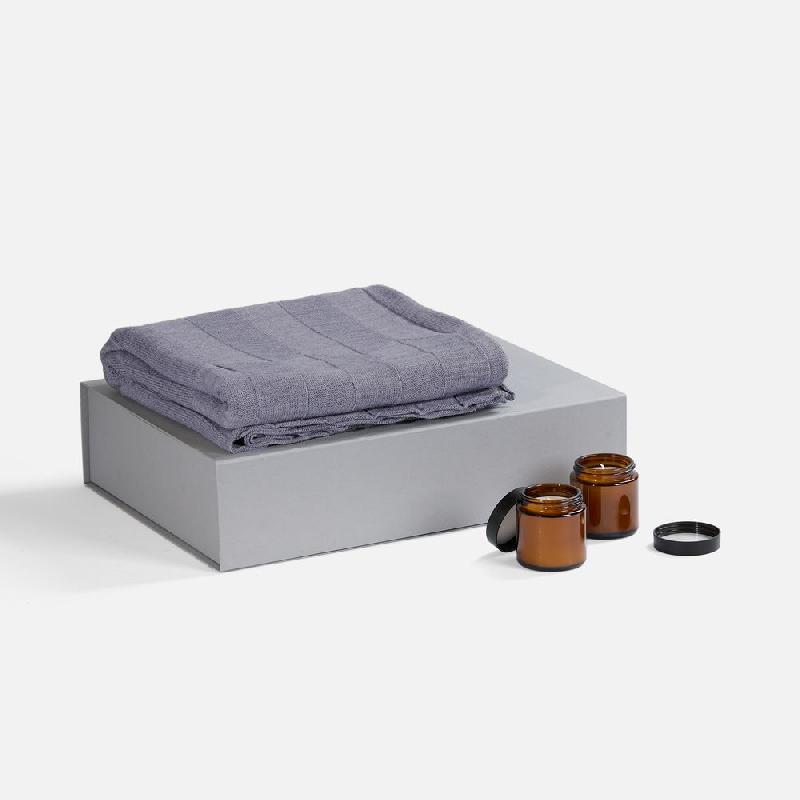 плед - акрил 100%, плотность 286 г/м²; подсвечник - стекло, крышка - пластик; свеча - парафин, соевый воск, парфюмерная композиция; коробка - переплетный картон, бумага Malmero