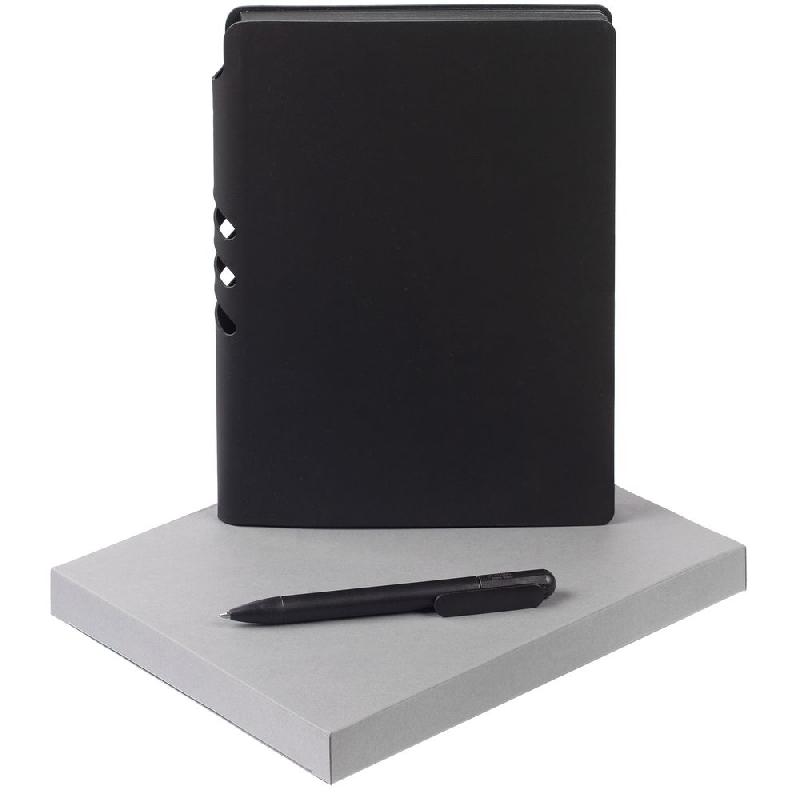 Удобный ежедневник с гибкой обложкой и местом под ручку в корешке, миниатюрная ручка из переработанного пластика и компактная самосборная коробка — простые составляющие полезного делового набора.