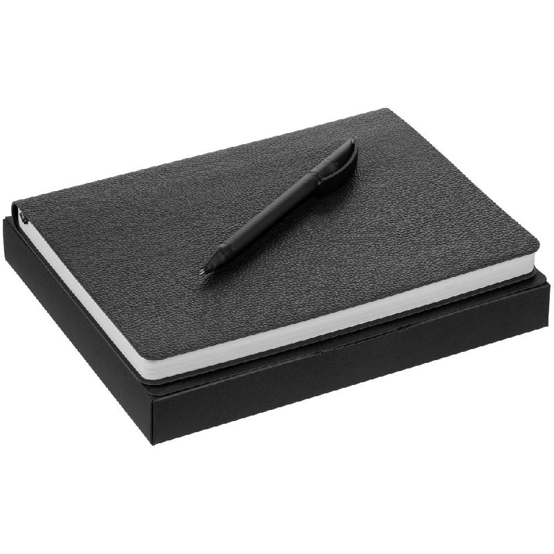 Недатированный ежедневник с гибкой обложкой из фактурного материала La Fite и металлическим шильдом на ляссе и ручка в тон, упакованные в подарочную коробку из дизайнерского картона.