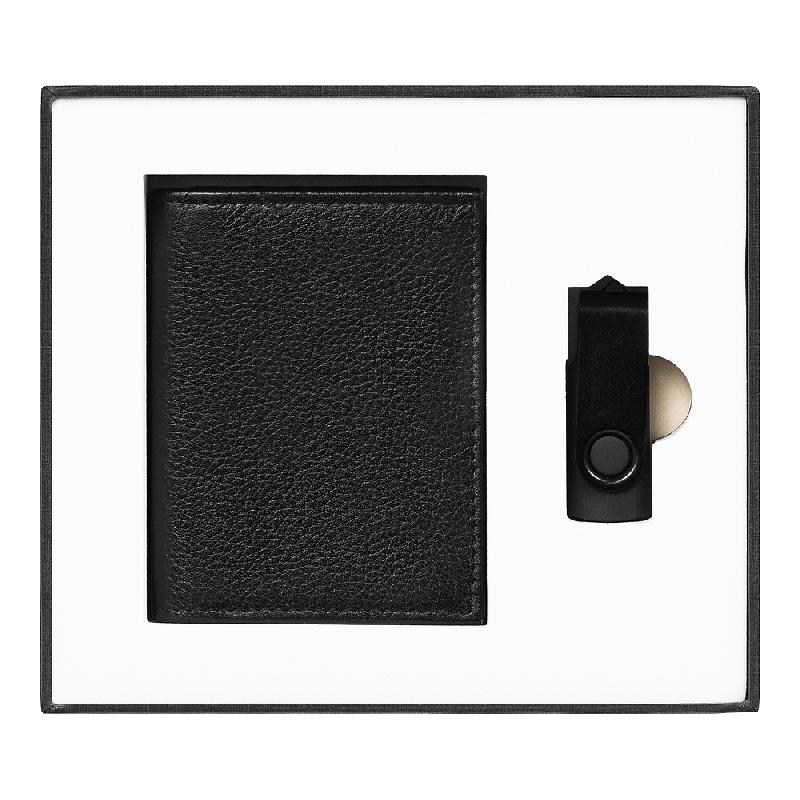 Состав набора: 1. Коробка подарочная 16x14,2 см. Подарочная коробка изготовлена из переплетного картона, снаружи кашированного дизайнерской бумагой фактурой имитирующей лен. Материал ложемента: EVA, цвет бежевый, покрытие флок цвет бежевый. 2. Флеш накопитель USB 2.0 Twister. Флешка представлена в различных цветах на любой вкус, а также размерах от 8GB до 64GB. Размер: 5,6x1,9 см 3. Футляр для кредитных карт и визиток из натуральной кожи Leather Land из нат. кожи. Универсальный футляр из натуральной кожи. В изделии есть место для банкнот и кредитных карт, а также для других мелких предметов. 10,2x7,8 см