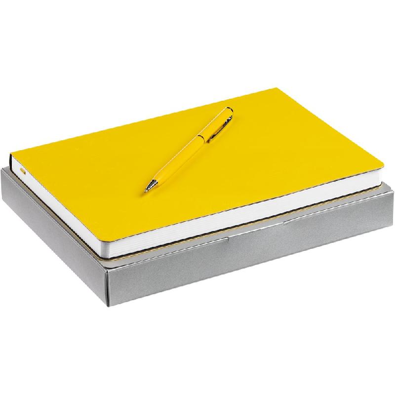 Недатированный ежедневник с гибкой обложкой из материала Latte с ляссе в цвет обложки, а также ручка в тон — в подарочной коробке из дизайнерского картона.