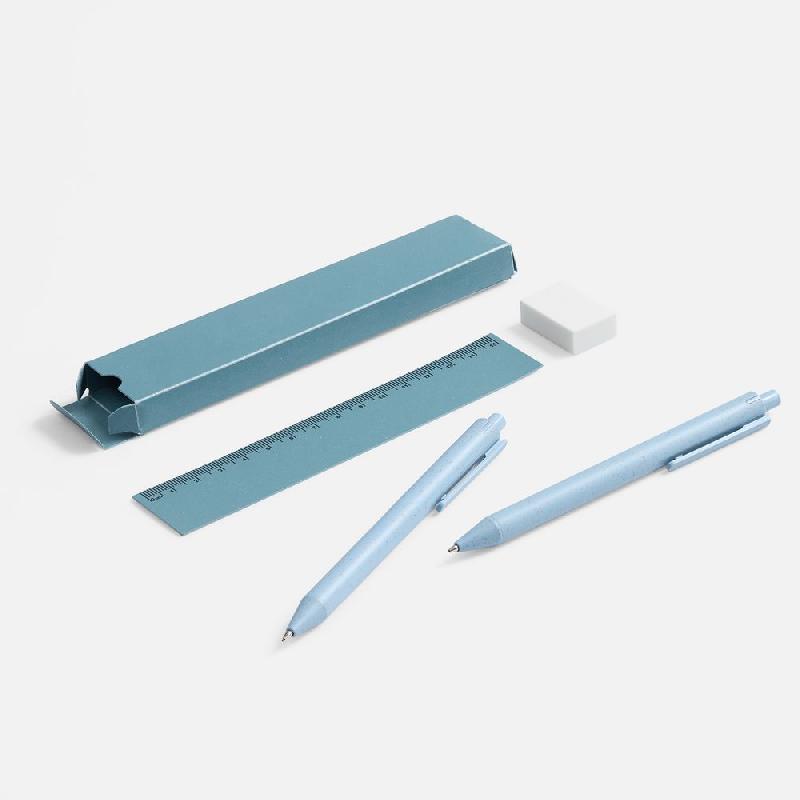 В комплекте ручка, механический карандаш, линейка, ластик и упаковка.