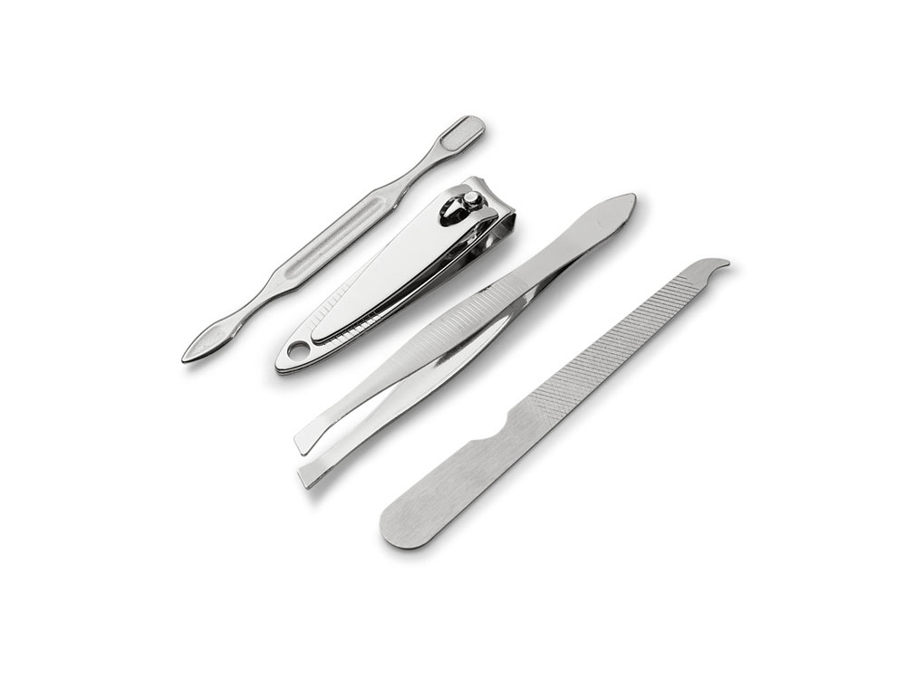 Набор из 4 предметов для маникюра в пакете из ПВХ, состоящий из пилочки, пинцета, щипчиков для ногтей и лопатки для кутикулы. 66 x 105 мм. Вид нанесения, рекомендуемый поставщиком: трафаретная печать, гравировка.
