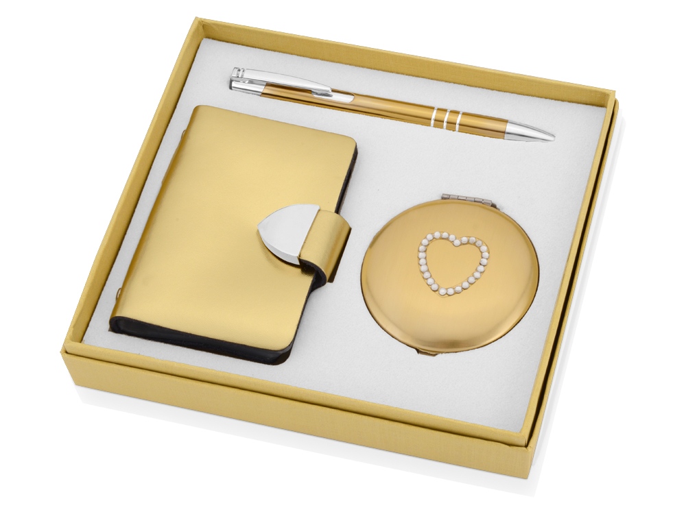 Отличный набор из шариковой ручки, визитницы и зеркала с изображением сердца. Набор выполнен в красивом серебристом или золотистом цвете. Вы можете выгравировать поздравительный текст и сделать набор именным.