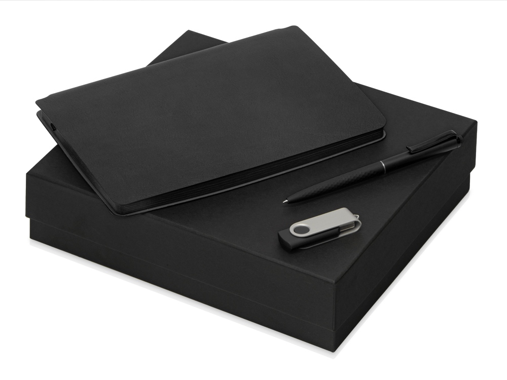 блокнот- черный, флешка- черный/серебристый, ручка- черный