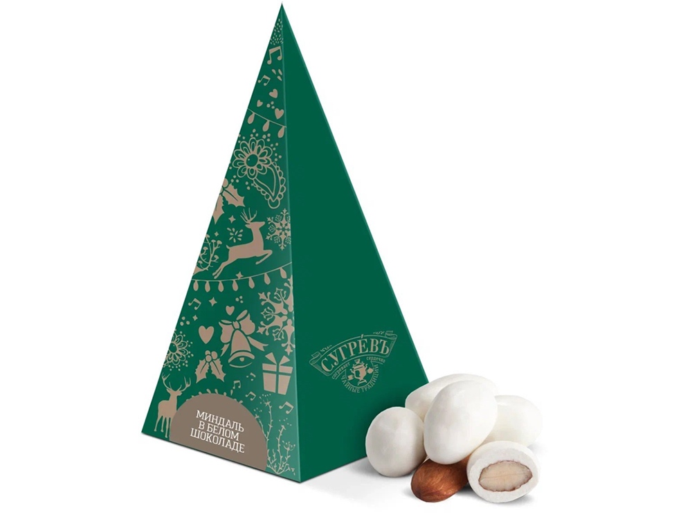 Картонная ёлка с выборочным УФ-лаком с миндалём в шоколадной глазури внутри. прекрасное дополнение к любому подарку на Новый Год и Рождество. Яркая праздничная упаковка и интересное наполнение.