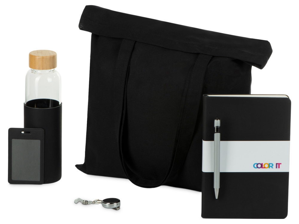 Welcome pack для нового сотрудника, в который входит все самое необходимое для комфортной адаптации в новом офисе: блокнот с магнитным держателем для ручки и карманом для визиток, ручка, чехол для пропуска с ретрактором, стеклянная бутылка для воды и шоппер.