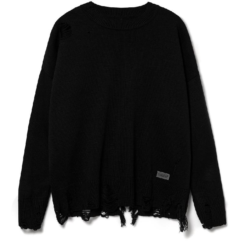 Оверсайз джемпер с круглым вырезом и рваными краями. Ворот, манжеты и низ изделия выполнены резинкой.