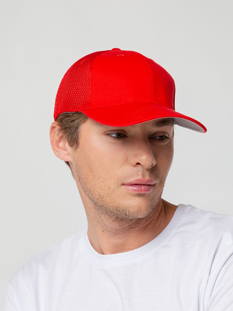 Однотонная бейсболка из двух видов ткани: козырек и лобовые клинья из гладкого полотна, клинья на боках и на тыльной стороне из спортивной сетки
