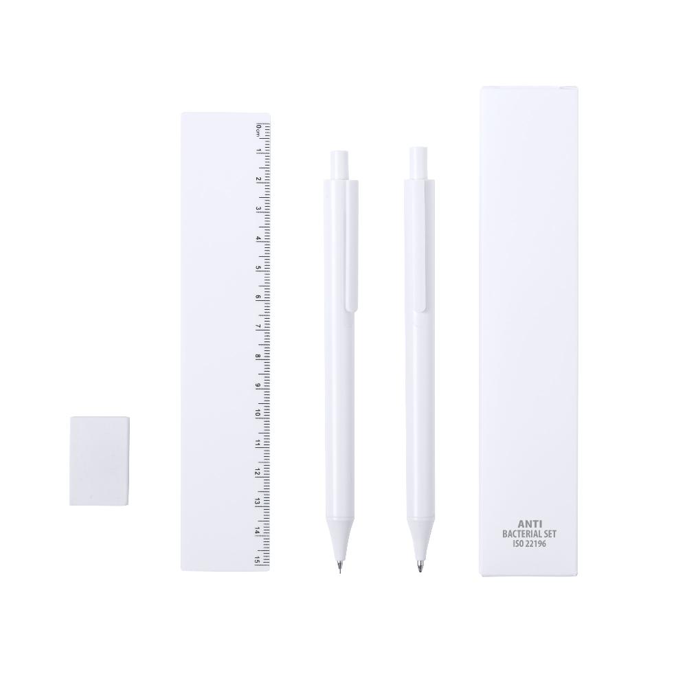 Антибактериальный набор включает ручку, механический карандаш (грифель 0,5 мм в комплекте), линейку на 15 см и ластик. Благодаря добавлению высокоэффективных противомикробных агентов достигается резкое снижение уровня бактерий, присутствующих на поверхностях материалов. Изделие соответствует стандарту ISO 22196, который определяет антибактериальную активность пластмасс и непористых поверхностей.