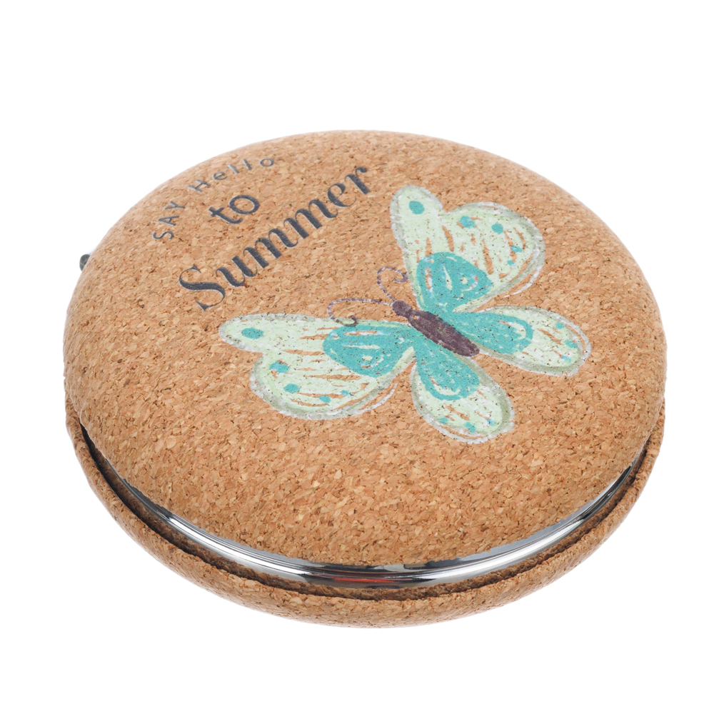 Оригинальное карманное круглое зеркало из пробкового материала. Одно из зеркал - с увеличивающим эффектом. Используется в бытовых целях. Диаметр 72 мм.
