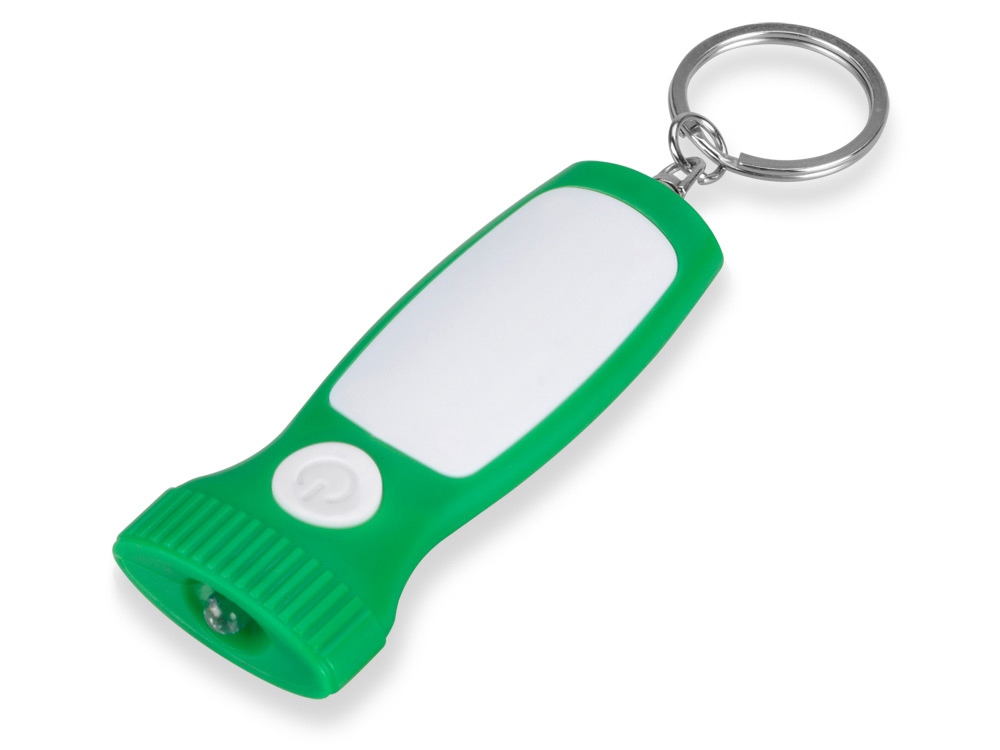Яркий брелок со встроенным фонариком. Плоская форма и большая ручка с белой вставкой делает брелок удобным для нанесения логотипа.