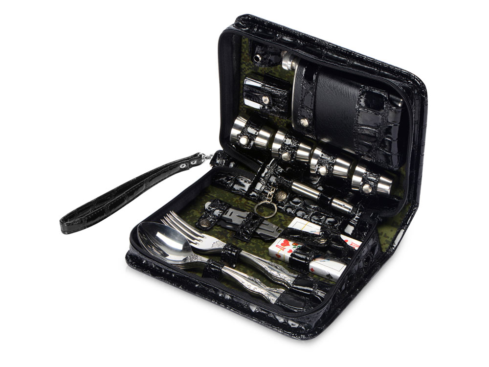 Оригинальный дорожный набор на 4 персоны в барсетке с удобным ремешком для переноски. Барсетка из искусственной кожи, отделка- натуральная кожа с художественным выжиганием.
