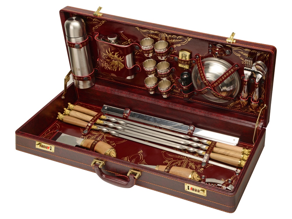стопки- прозрачный/золотистый, шампура- серебристый/коричневый, дипломат- темно-коричневый