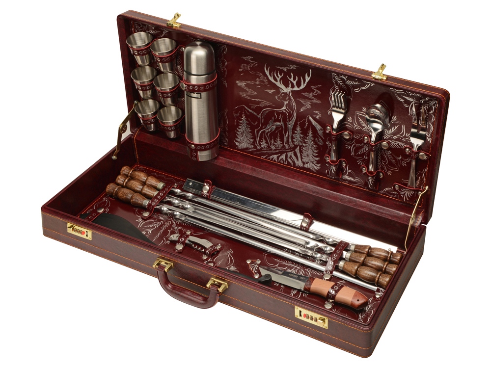 стопки- прозрачный/золотистый, шампура- серебристый/коричневый, дипломат- темно-коричневый