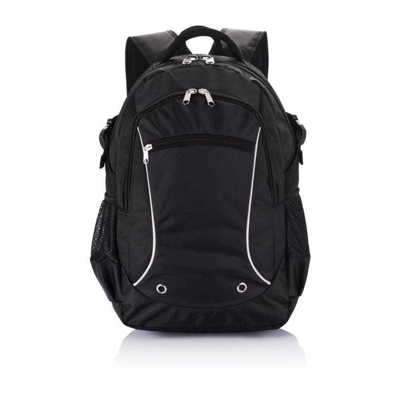 Рюкзак для ноутбука Denver изготовлен из жаккарда и полиэстера 1680D. Включает в себя передний карман на молнии с органайзером, основное отделение для ноутбука с диагональю 15,6” и 2 боковых кармана. Рюкзак оснащен светоотражающей окантовкой.