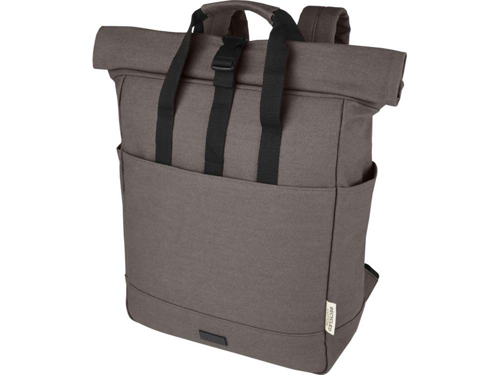 Изготовленный из высокопрочных экологичных материалов, брезента и подкладки из переработанного ПЭТ, соответствующих стандарту GRS, рюкзак Joey со сворачивающимся верхом имеет специальный чехол для планшета и отделение с подкладкой для ноутбука диагональю 15 дюймов. Рюкзак также имеет 2 боковых кармана для воды, один большой передний карман на молнии и сворачивающуюся верхнюю часть на молнии для максимальной вместимости и безопасности. Две усиленные вязанные ручки обеспечивают удобство и простоту ношения в качестве деловой сумки-тоут. Декоративная металлическая пластина может придать логотипу сияние благодаря утонченному матовому покрытию.