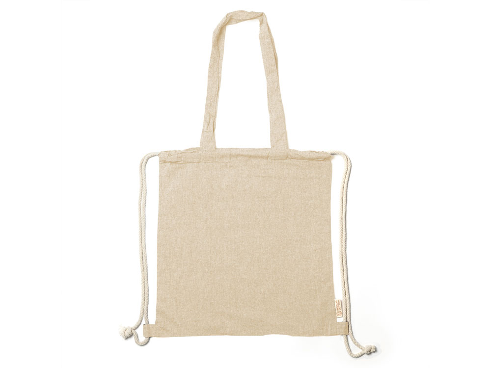Рюкзак-мешок из переработанного хлопка плотностью 140 г/м² с меланжевой отделкой, ручками длиной 70 см в тон и шнурками натурального цвета.