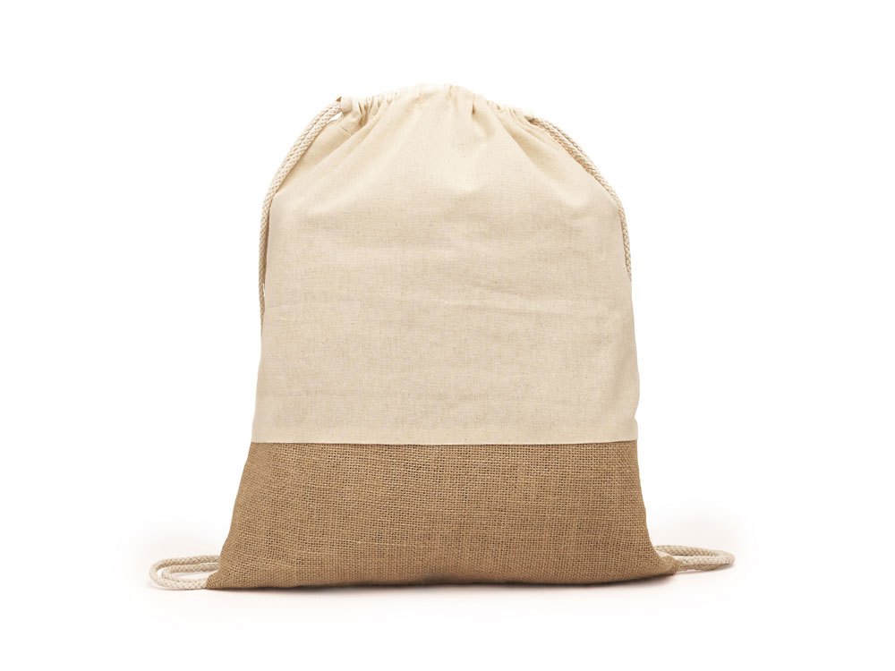 Рюкзак-мешок Eco line из хлопка и джута плотностью 120 г/м². Натуральный цвет. Спереди рюкзак имеет джутовую ленту на нижней части.