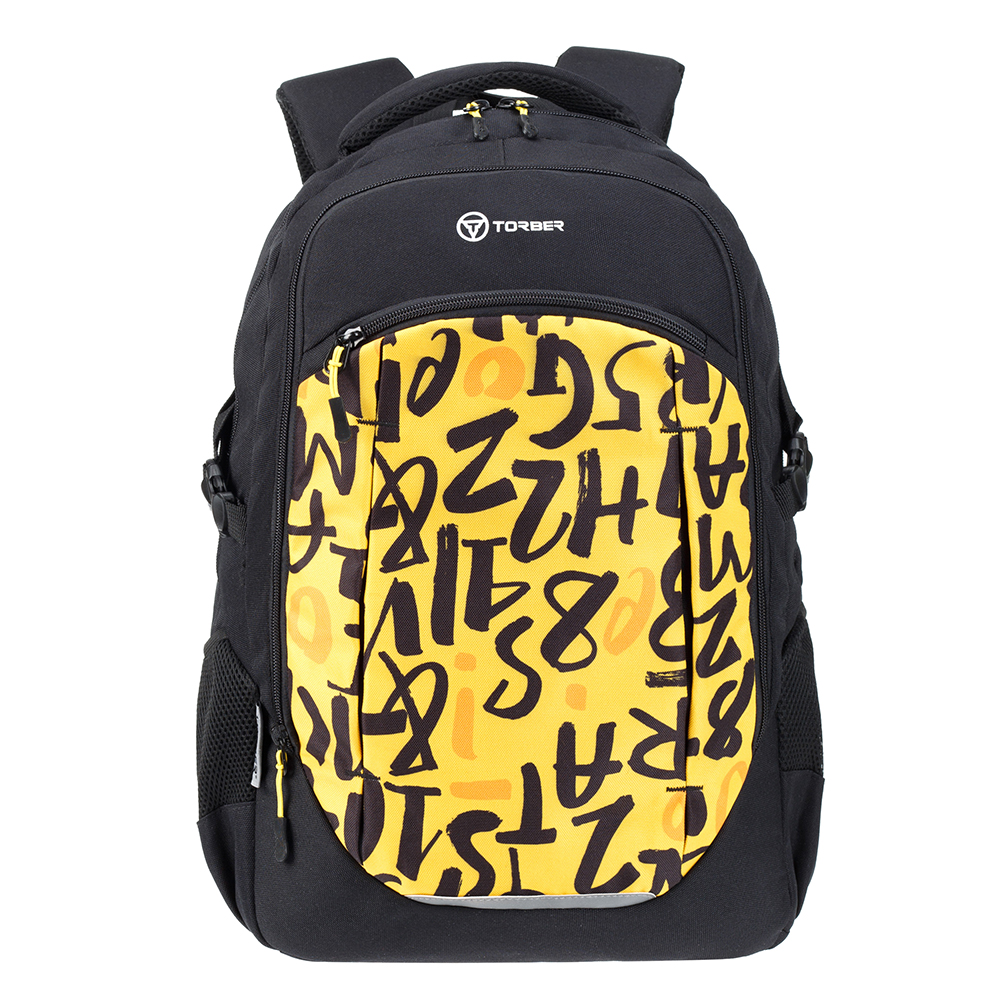 Рюкзак TORBER CLASS X, черно-желтый с принтом "Буквы", полиэстер 900D, 46 x 32 x 18 см