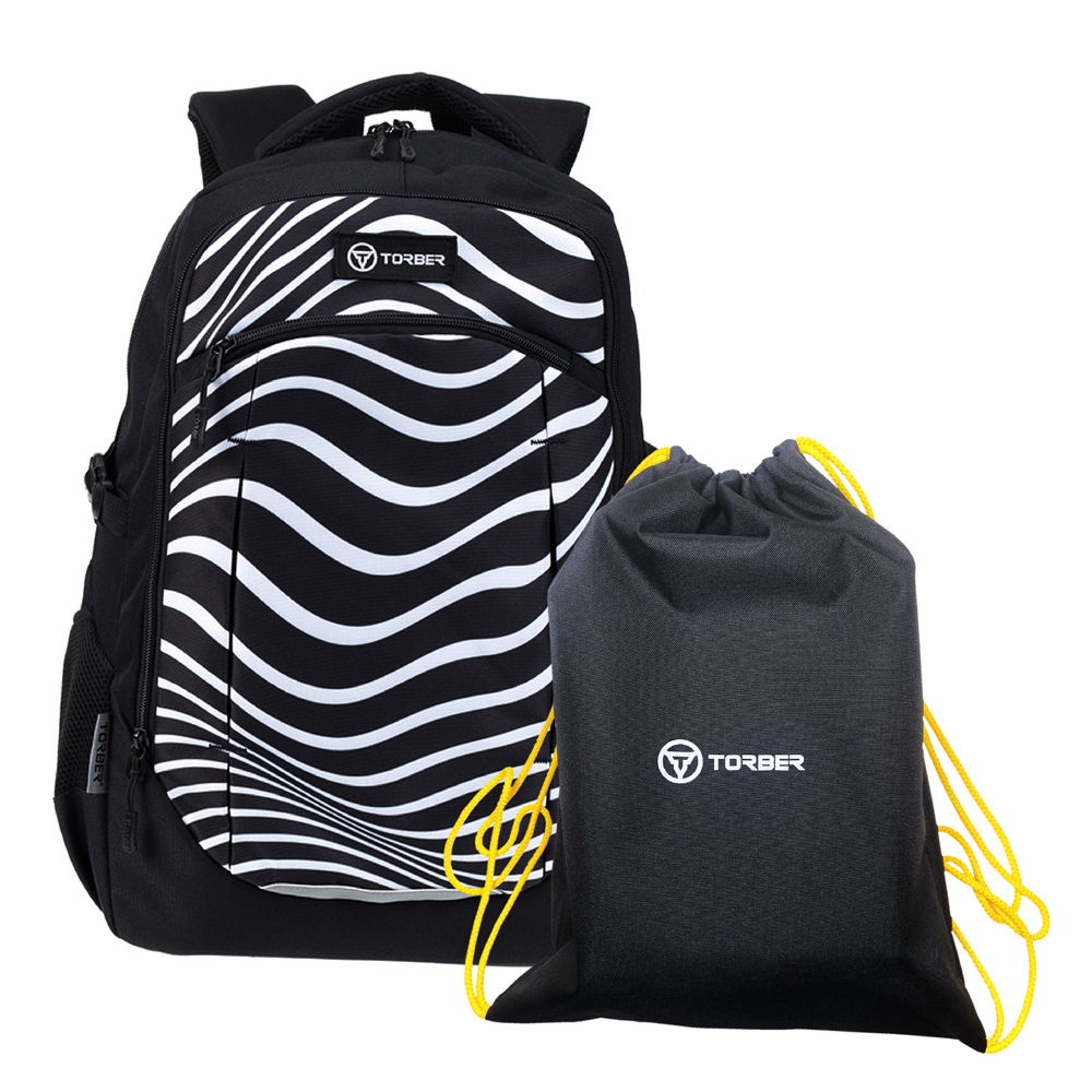 Рюкзак TORBER CLASS X, черный с принтом "Зебра", 46 x 32 x 18 см+ Мешок для сменной обуви в подарок!
