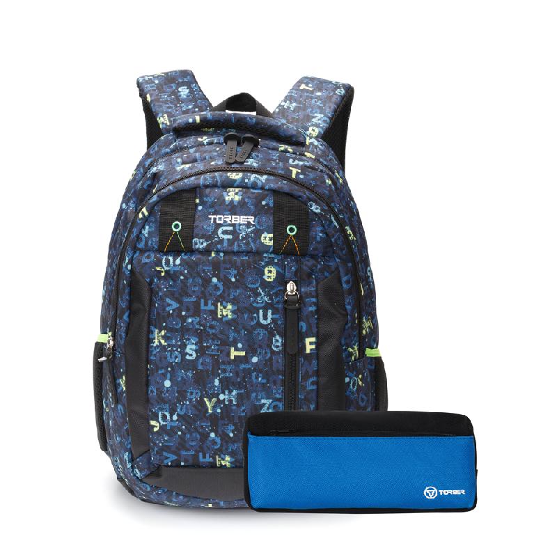 Рюкзак TORBER CLASS X, темно-синий с рисунком "Буквы", полиэстер, 45 x 32 x 16 см + Пенал в подарок!