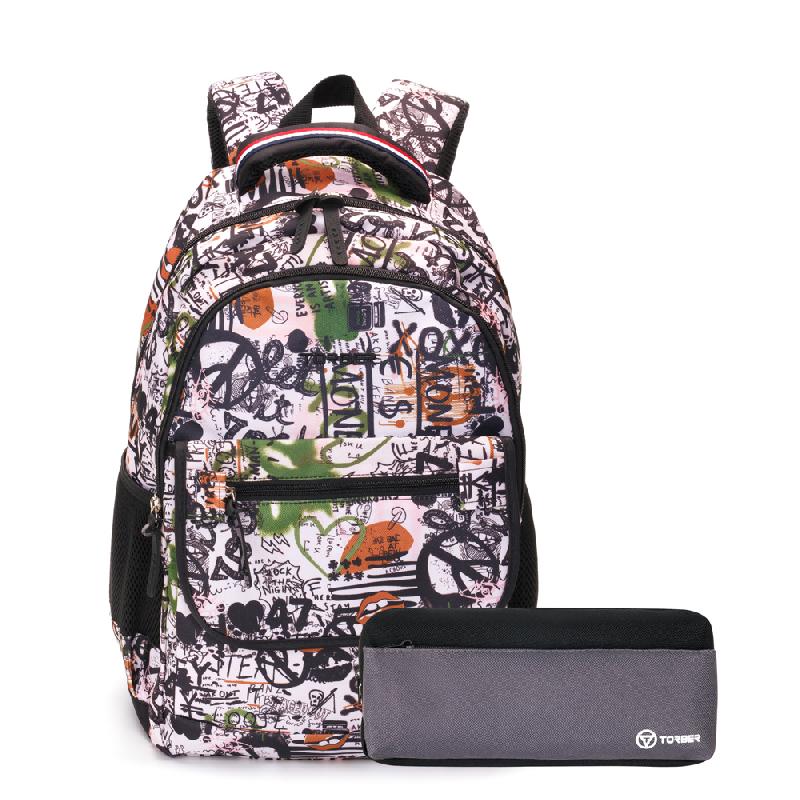 Рюкзак TORBER CLASS X, черно-белый с рисунком, полиэстер, 45 x 30 x 18 см + Пенал в подарок!