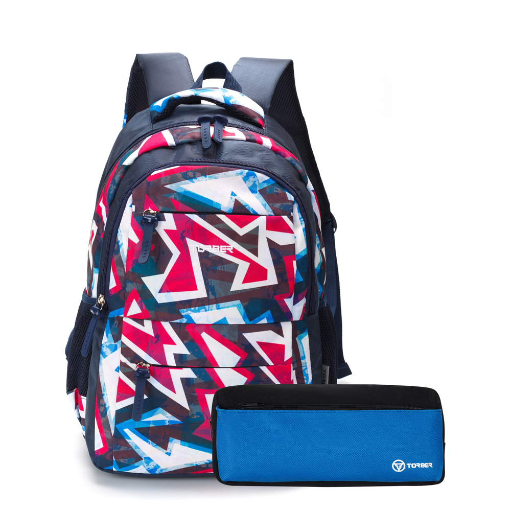 Рюкзак TORBER CLASS X, темно-синий с розовым орнаментом, полиэстер, 45 x 30 x 18 см + Пенал в подарок