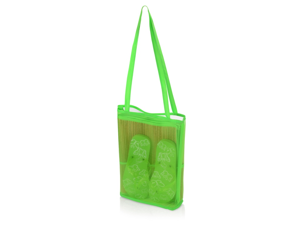 Замечательный набор включает в себя циновку, шлепанцы (размер 38) и сумку яркого цвета – все, что нужно для комфортного отдыха на берегу водоема. Набор имеет две расцветки: синюю и зеленую.