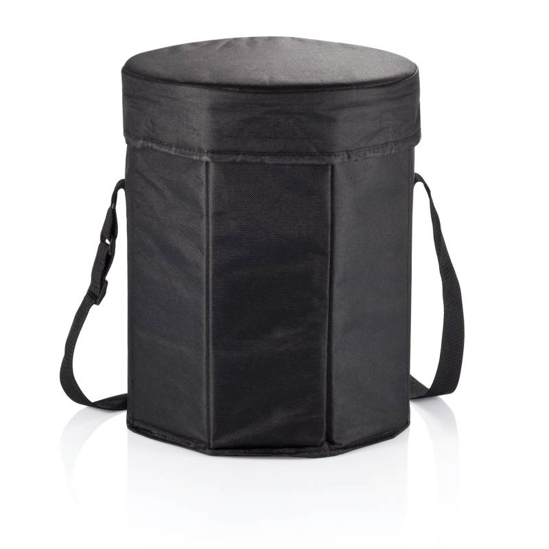 Складная сумка-холодильник с полиэтиленовым покрытием. Разложенная сумка с закрытой крышкой превращается в табурет диаметром 30 см. Удобно использовать и в качестве холодильника, и в качестве табурета.