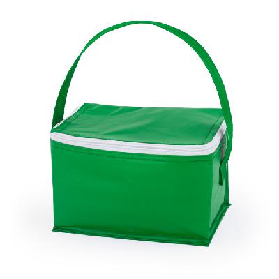 Сумка-холодильник с подкладкой из изотермического алюминия на 6 банок. Внешняя поверхность из полиэстера. Ручка для переноски и застежка-молния. Вместимость: 3 л.
