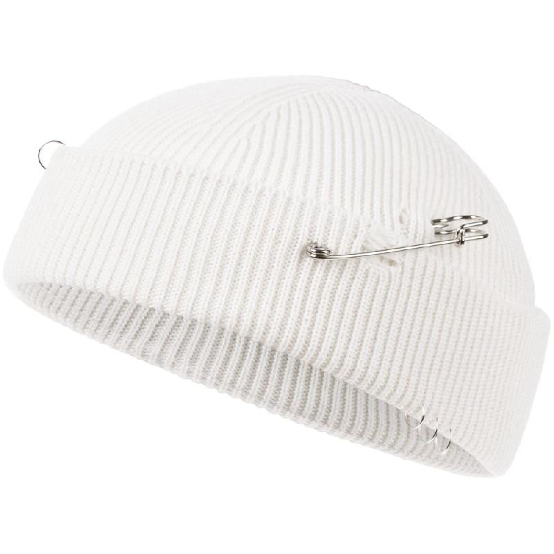 Однослойная шапка бини с рваным отворотом и металлическими аксессуарами для дерзких образов в любом возрасте. Яркий и запоминающийся акцент в стиле гранж.
