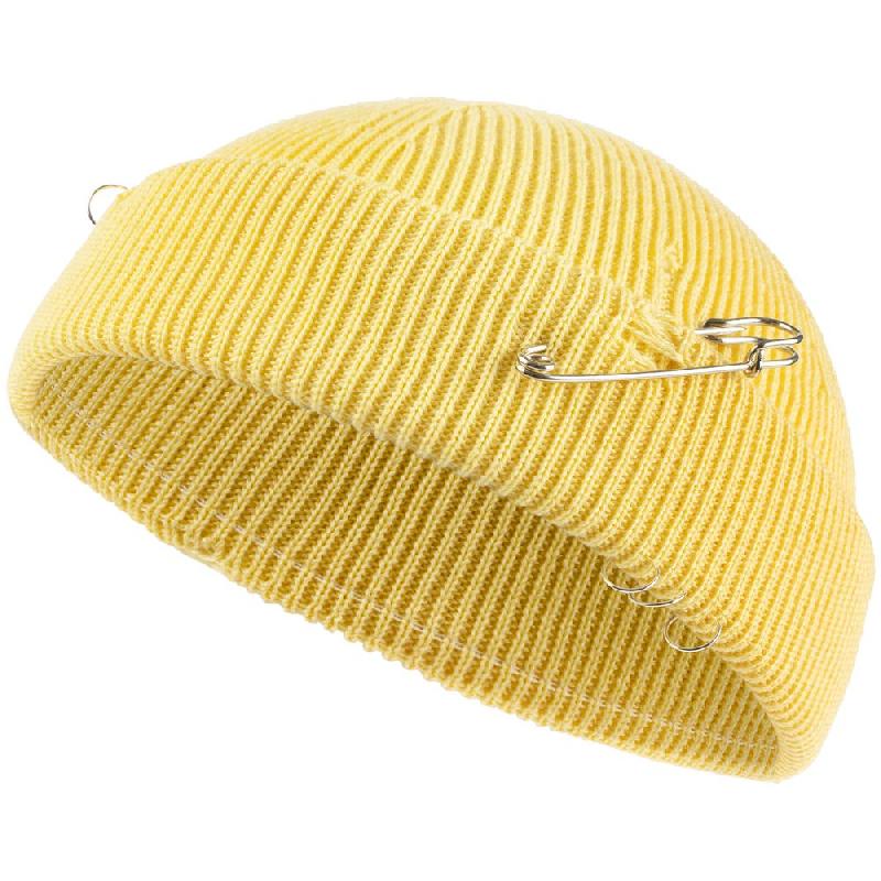 Однослойная шапка бини с рваным отворотом и металлическими аксессуарами для дерзких образов в любом возрасте. Яркий и запоминающийся акцент в стиле гранж.