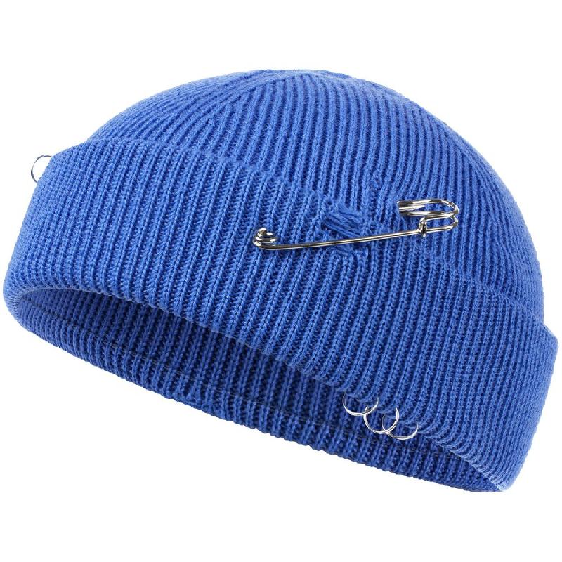 Однослойная шапка бини с рваным отворотом и металлическими аксессуарами для дерзких образов в любом возрасте. Яркий и запоминающийся акцент в стиле гранж.