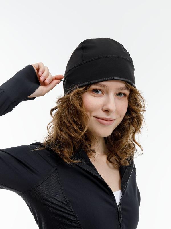 Шапка выполнена в черном цвете, но имеет светоотражающую полосу вдоль края, что улучшает видимость спортсмена в условиях плохой освещенности.